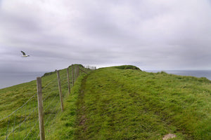 The far-off vast island of Mykines Island sits out in the middle of the Atlantic Ocean. It took a ferry to get to this little island that has no cars, beautiful highland cattle, lots of sheep and is a favorite for nesting puffins. We hiked to the top of this beautiful hill, only a thin fence diving us from the cliffs jetting down to the oceans rocky coast. This beautiful seagull came in for a landing to rest her wings after flying out far over the chilly, rough waters of the Atlantic.