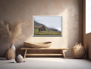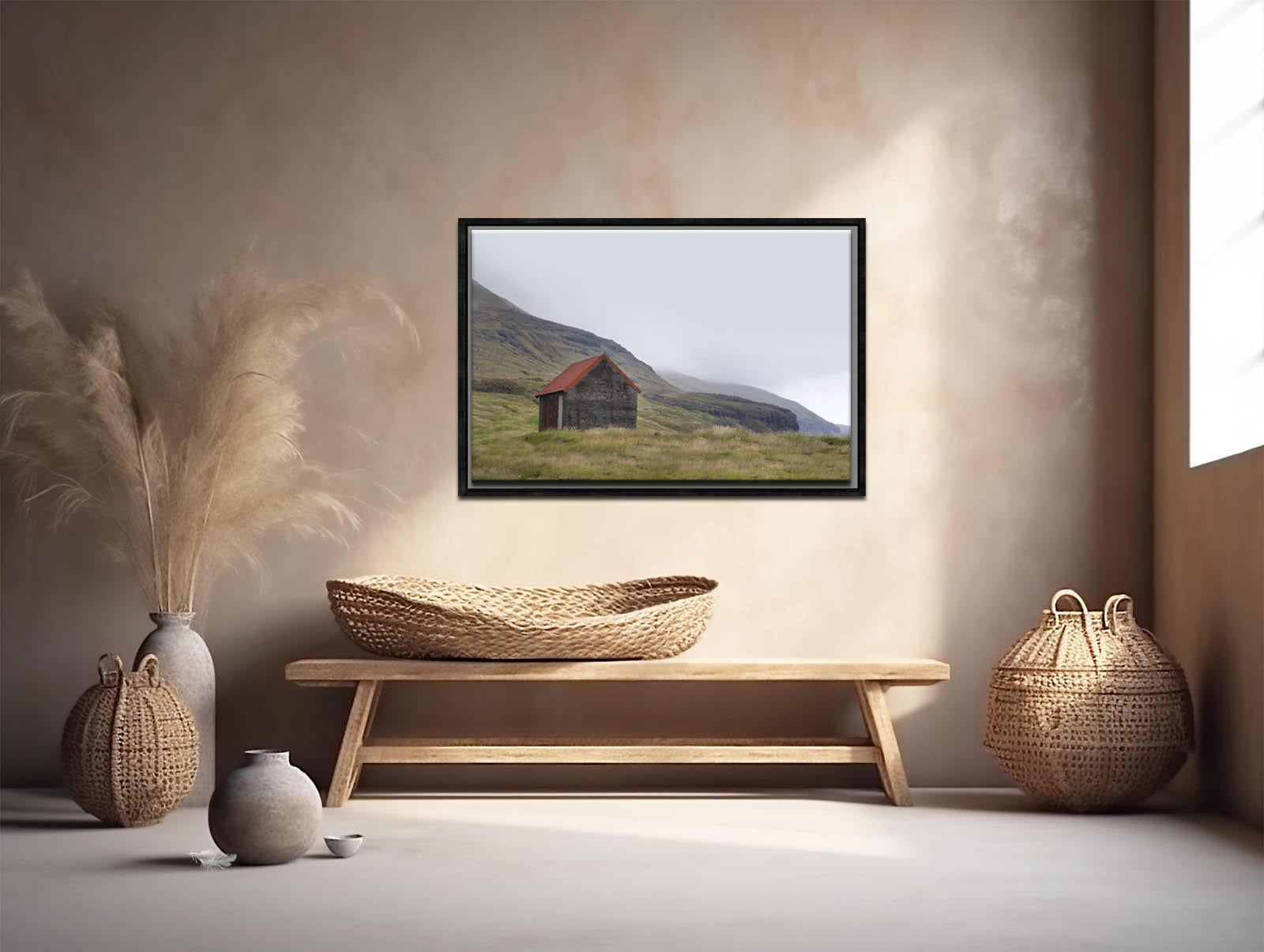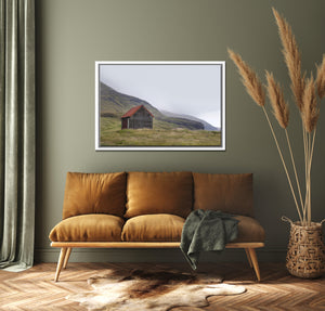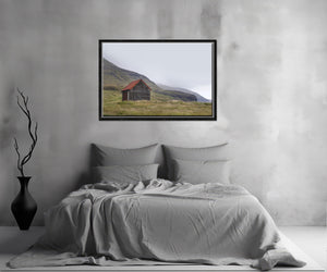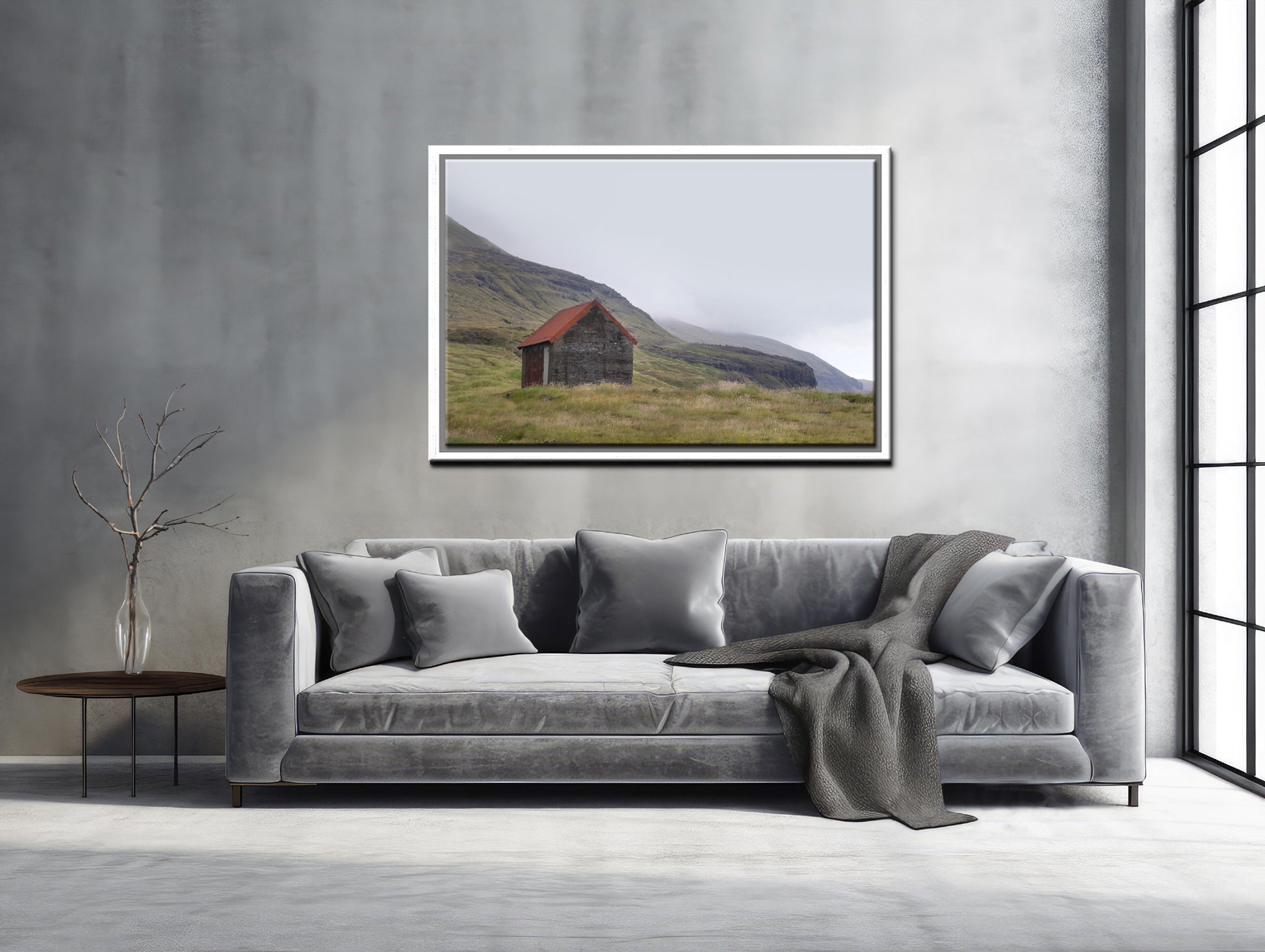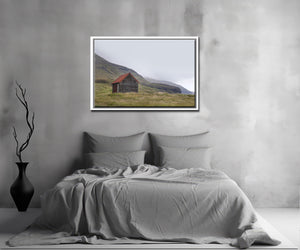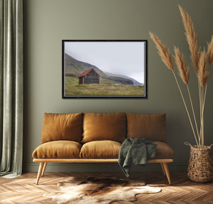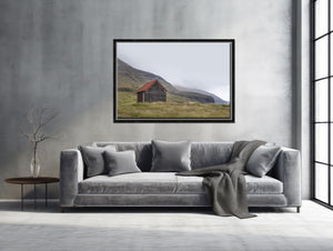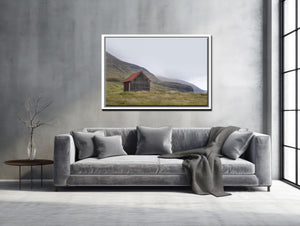 Rusty Roof Shack-Fine Art Photography-Old, Stone Shack in the Fog of the Faroe Islands