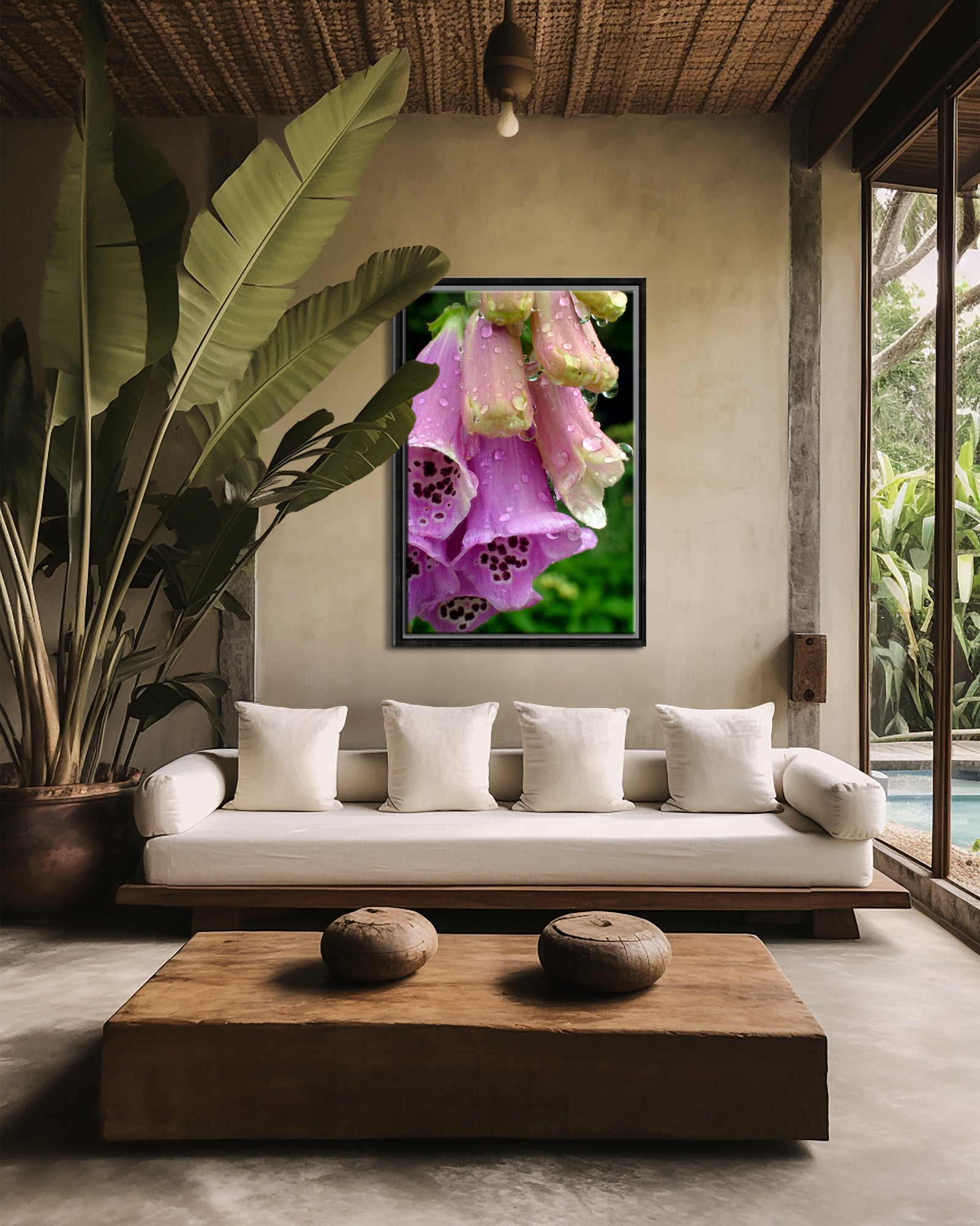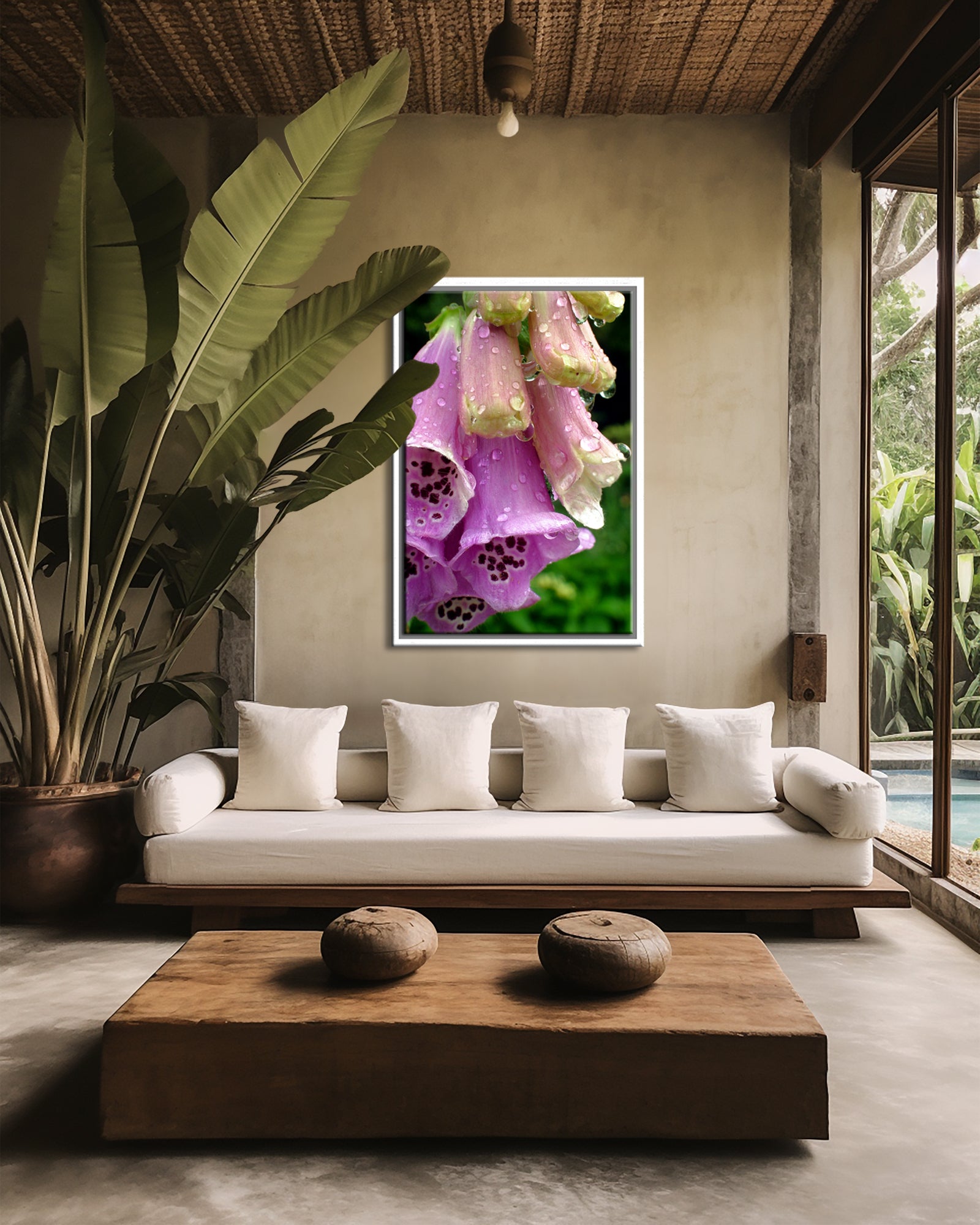 Bright flowers, the garden and freshly fallen rain tracing waxy petals. Can't get much better than that. What a great image to add a vibrant pop of color to your space!