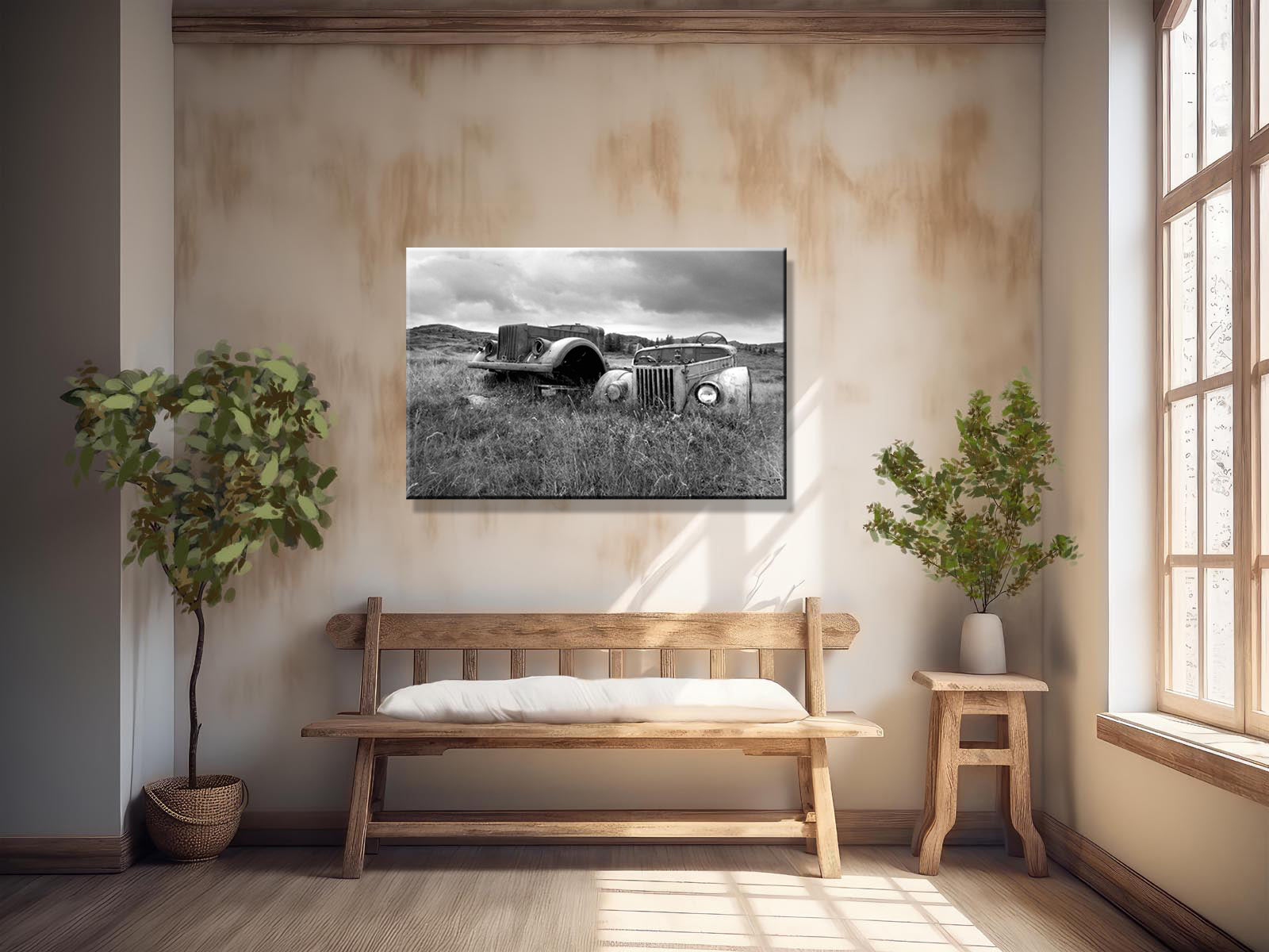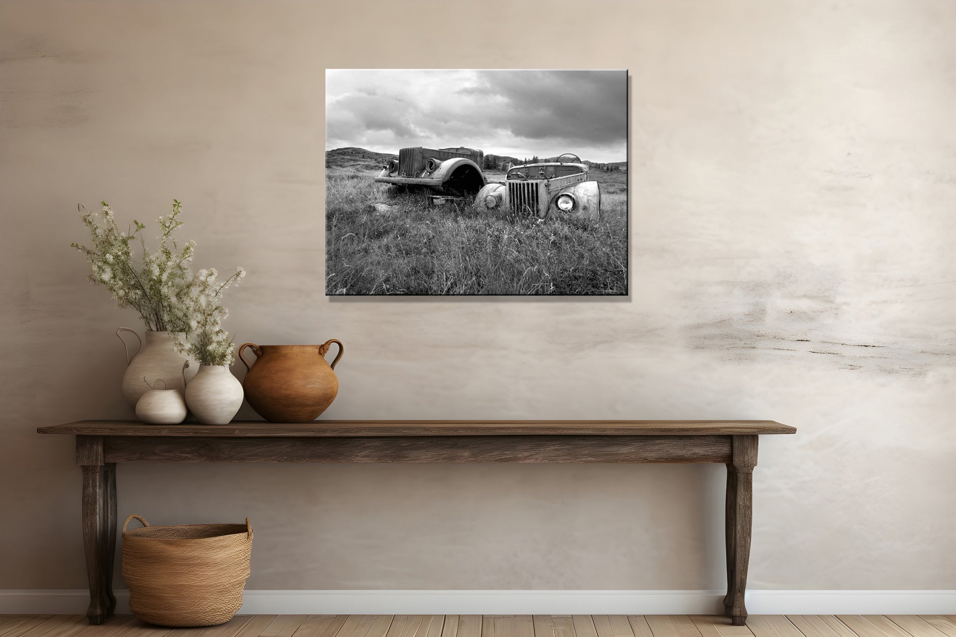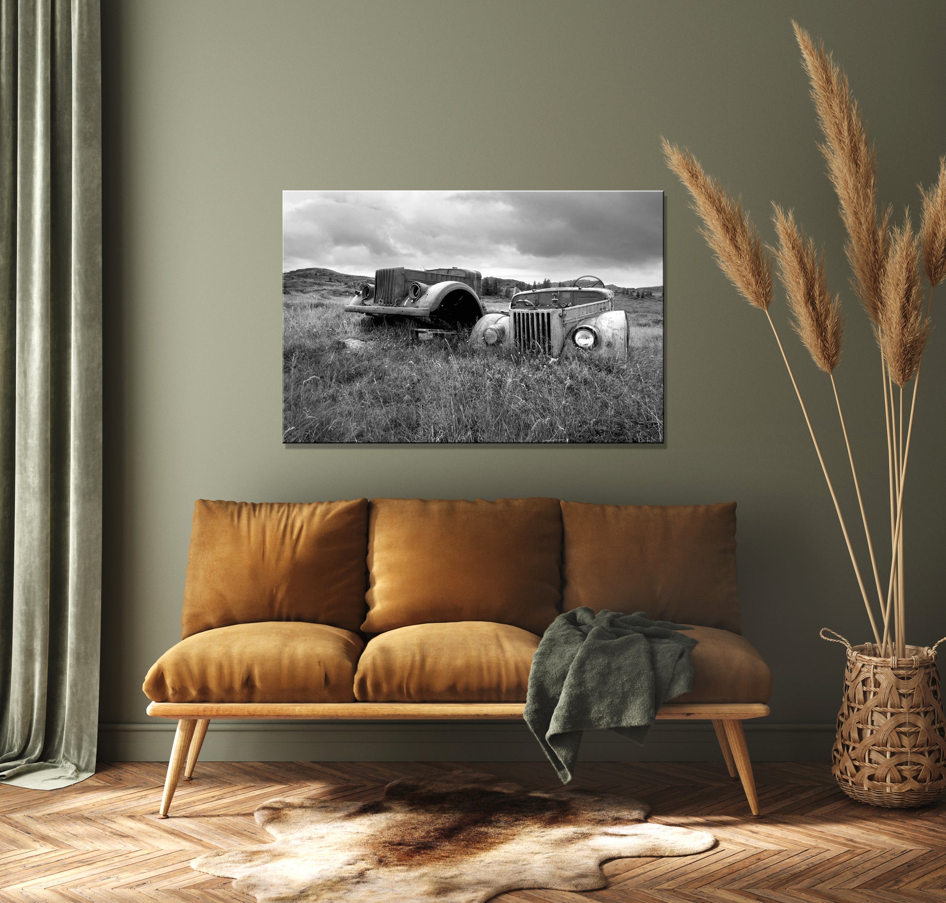Old Time Cars-Fine Art Photography-Printed on Metal-Old-time Cars-Iceland-Black and White