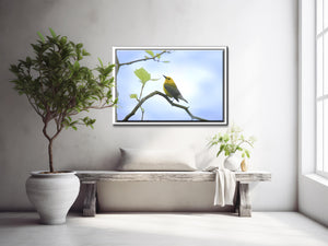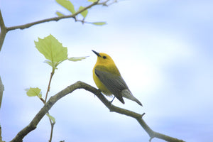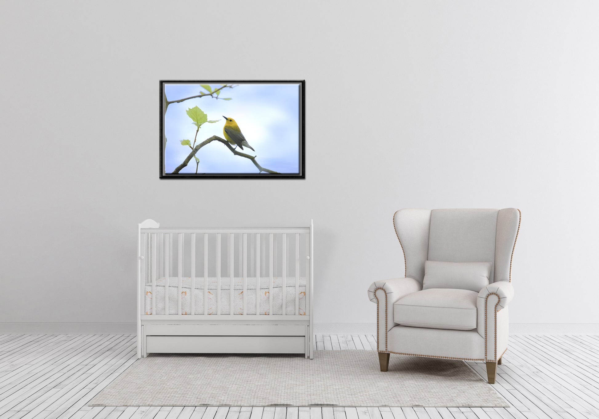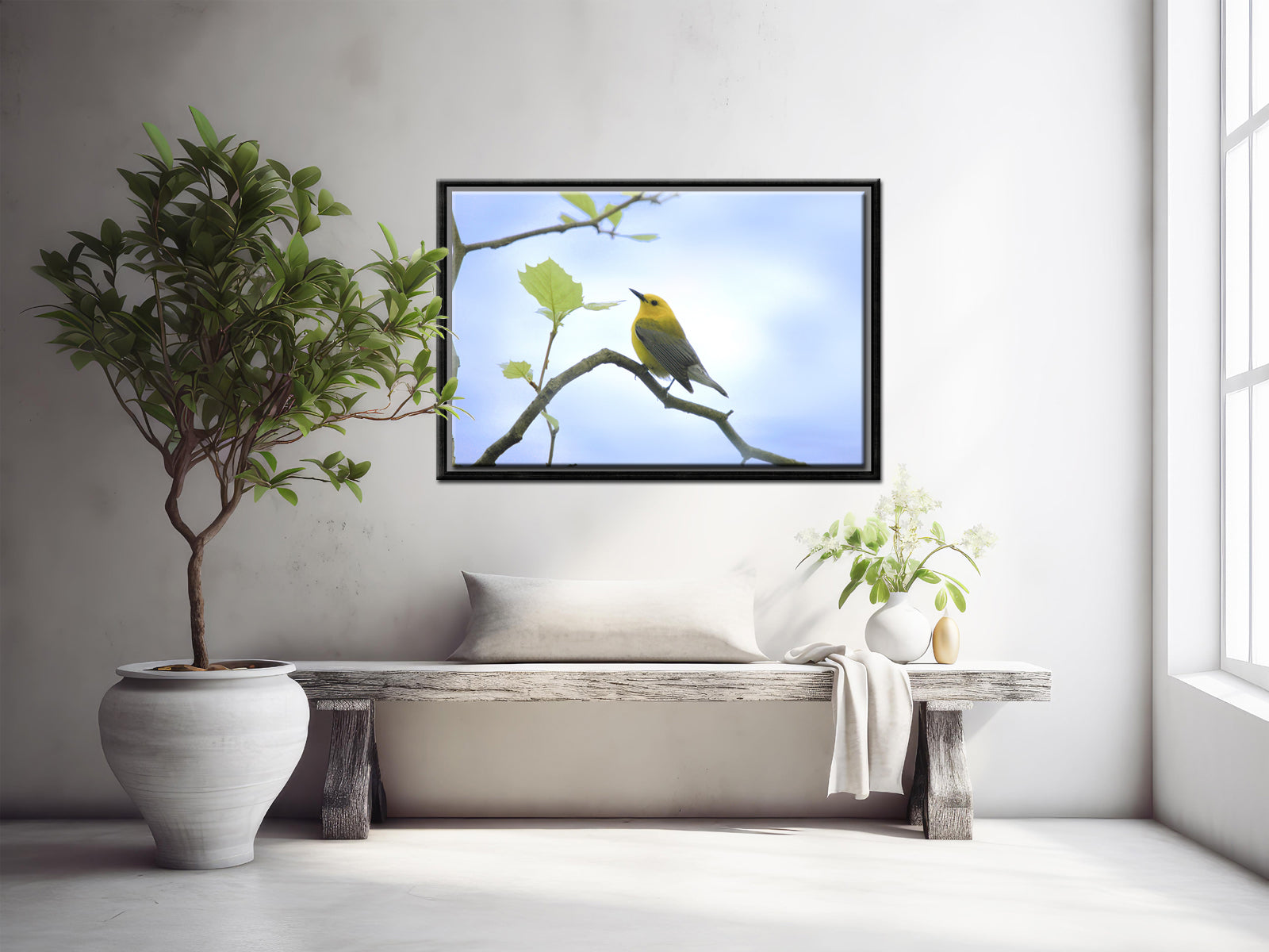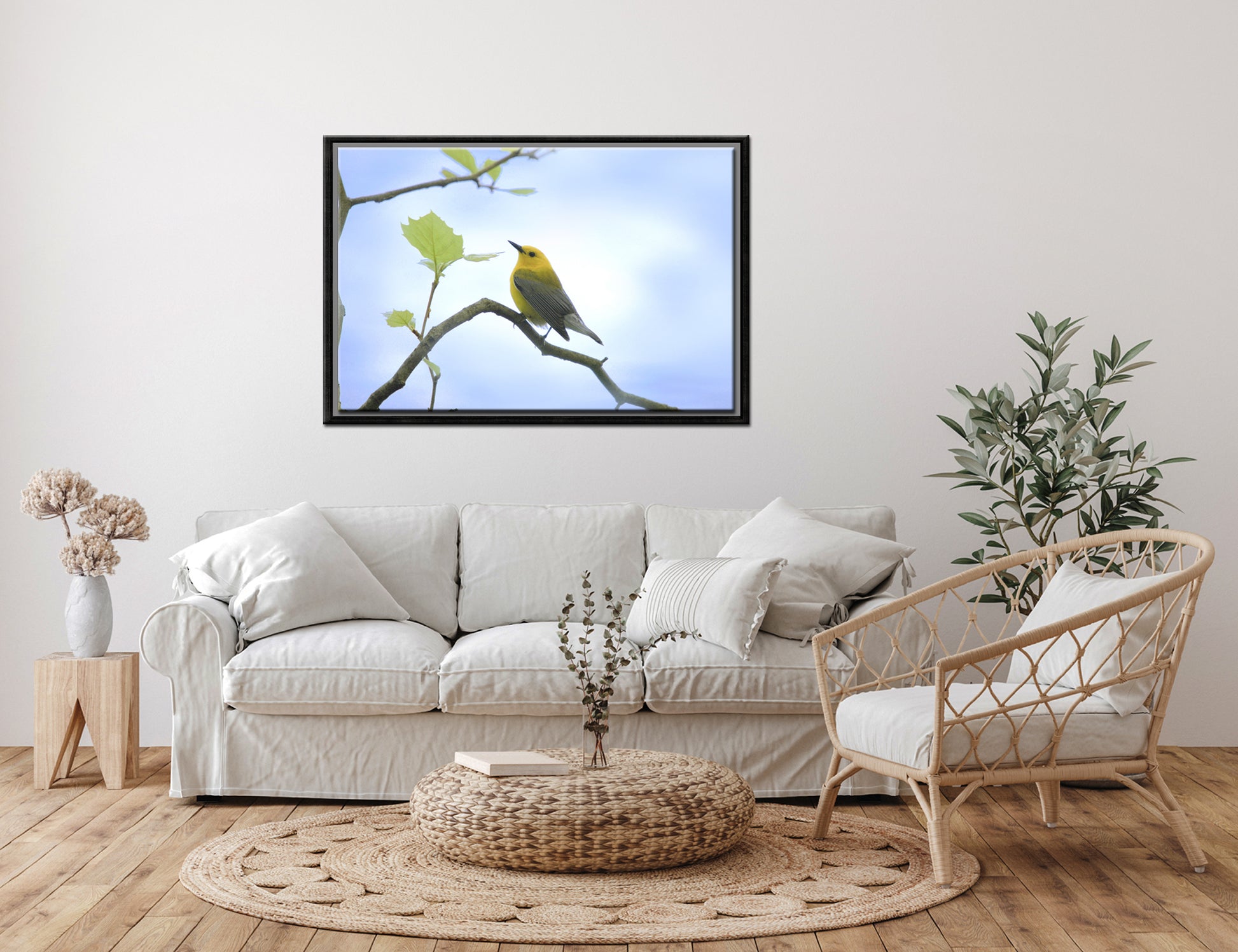I love Warblers. They are such cute little birds, but also very active, busy birds...which make capturing them through my lens a challenge. Of all Warblers, the Prothonotary Warbler is my favorite. I love his bright colors and beautiful sound. I was lucky to capture this guy here, his yellow feathers standing out so bright against the rich blue sky. What a happy little image to add to brighten up any room of your home.